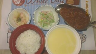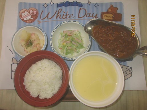 かわいいホワイトデーのランチョンマットで、お食事を提供させていただきました。