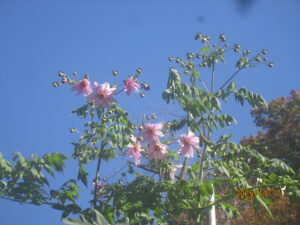 せせらぎの玄関前2メートルを超える高さに鮮やかなピンクの花が咲いています。