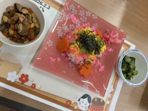ちらし寿司、五目煮豆、きょうりの酢味味噌和、おすましです。