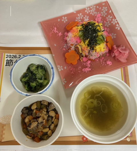 ちらし寿司、五目煮豆、きょうりの酢味味噌和、おすましです。